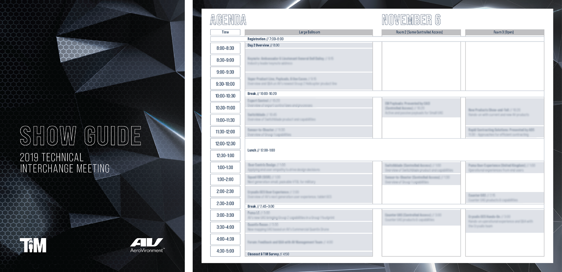 AeroVironment hosts a Technical Interchange Meeting (TIM) every two years, providing customers with comprehensive information and insights into AeroVironment’s current and future products. I wanted to create a visual style that emphasized end users. I created graphics that focused on the details of what these products are and can do for the end user. The visuals were built off a branding look AeroVironment had at the time.